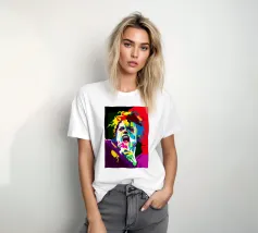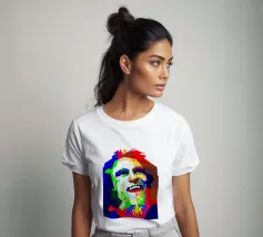 Un ritratto vibrante e geometrico di Sinead O'Connor in stile WPAP, caratterizzato da forme audaci e angolari e da un'impressionante gamma di colori vivaci e contrastanti. L'opera cattura i suoi tratti iconici, come la testa rasata, gli occhi penetranti e la forte espressione facciale, utilizzando blocchi di colore nitidi e frammentati. La composizione enfatizza la profondità e l'emozione mantenendo l'estetica pop-art cubista distintiva di WPAP, creando un tributo visivamente dinamico e moderno alla leggendaria cantante.