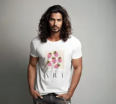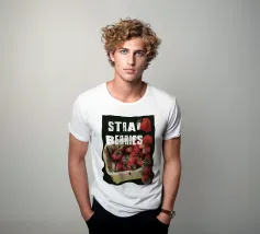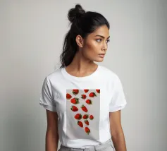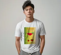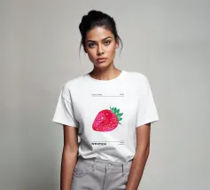 "Le parole 'Strawberry Fields Forever' sono impilate verticalmente in caratteri rossi su uno sfondo chiaro, con una fragola a fette che sostituisce lo '0' di 'Forever', creando un'atmosfera stravagante e nostalgica",