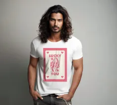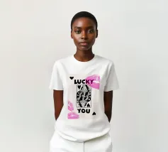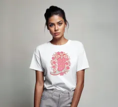 Una donna stilizzata che indossa un cappello da cowboy e occhiali da sole a forma di cuore è collocata su uno sfondo con cactus e cuori. La frase "Stuck On You" è ben visibile.