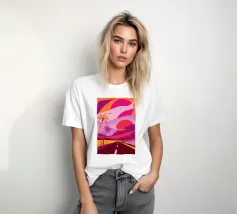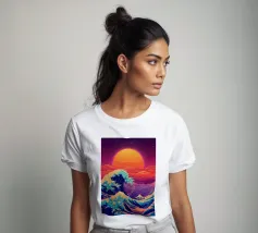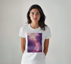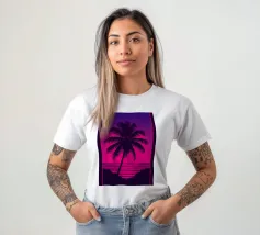 Questo motivo mostra una scena suggestiva in stile retrofuturistico: un enorme sole al tramonto colora il cielo di forti tonalità di giallo e magenta mentre sprofonda dietro una scura catena montuosa. In primo piano corre un pavimento luminoso a griglia che crea una prospettiva in profondità e termina in un corso d'acqua riflettente. Palme tropicali incorniciano l'immagine a sinistra e a destra. Lo stile visivo ricorda l'estetica synthwave e combina elementi naturali con immagini digitali.