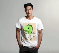 Un allegro dinosauro verde è decorato in modo spiritoso per assomigliare a un albero di Natale, con tanto di luci colorate e stella sulla testa. Le parole "Tree Rex" sono scritte in modo scherzoso accanto ad esso, per rendere ancora più festoso il tema.
