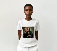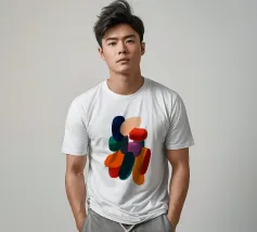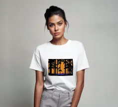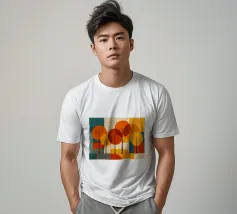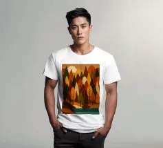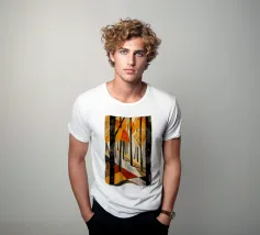 Una splendida rappresentazione astratta di una foresta autunnale con alti tronchi scuri e fogliame dorato. Lo sfondo caldo e luminoso esalta la composizione geometrica, creando un'atmosfera serena e moderna.