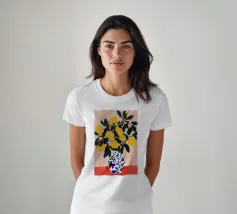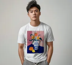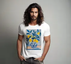 Un vivace bouquet di fiori e agrumi si trova in un vaso blu su un tavolo rosa. Lo sfondo è un mix dinamico di motivi a zig zag in bianco e nero e foglie verdi, che creano una natura morta moderna e giocosa.