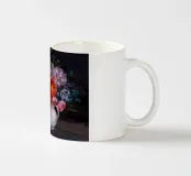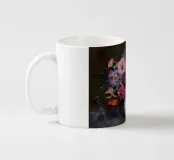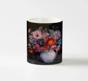 Una brocca bianca contiene un abbondante e traboccante bouquet di fiori in un tripudio di colori rosa, viola, rossi e gialli, dipinti in uno stile ricco, scuro e lunatico che sembra al tempo stesso classico ed espressivo.