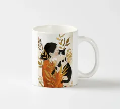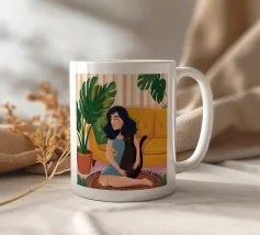 Una commovente illustrazione di una donna con una camicia a righe, con gli occhi chiusi, che abbraccia amorevolmente un grosso gatto rosso. Lo sfondo di piante in vaso contribuisce a creare un'atmosfera accogliente, da "genitore di piante e animali".