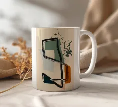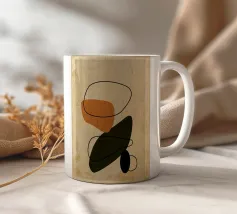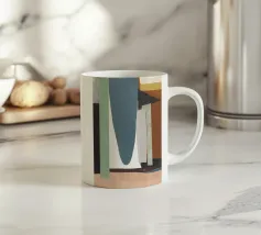 Forme astratte e pennellate decise nei toni della terra si combinano con uno sfondo chiaro. La composizione presenta rettangoli sovrapposti e schizzi a forma libera, creando un look dinamico e moderno.