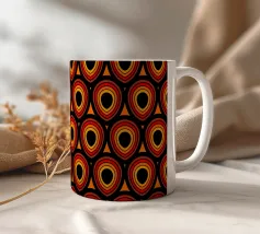 Audaci motivi geometrici con spirali, zigzag, punti e triangoli creano un vivace disegno simmetrico. I colori vivaci come l'arancione, il verde e il giallo contrastano formando un'immagine di grande impatto.