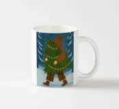 Simpatica e stravagante illustrazione natalizia di una donna che trasporta il suo albero di Natale in un paese delle meraviglie invernale. L'albero di Natale è illuminato da luci fatate.