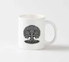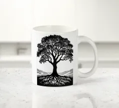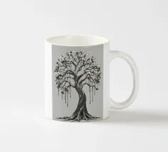 Questa silhouette mostra un albero nodoso e consumato dalle intemperie, con fili di muschio pendenti su cui sono appollaiati diversi corvi. Due lanterne pendono dai rami, mentre i pipistrelli volano sullo sfondo. Il disegno trasmette un'atmosfera misteriosa e un po' cupa che ricorda vecchie leggende o mondi fantastici. Ideale per gli appassionati di stile gotico, estetica fiabesca o decorazioni di Halloween. Il contrasto minimalista tra il nero e lo sfondo chiaro aumenta l'effetto drammatico.