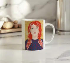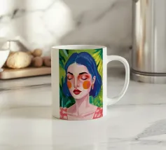 Ritratto moderno e artistico di una donna con capelli corti blu e camicia a righe arancioni e bianche. Il suo sguardo diretto e riflessivo e i colori decisi creano un'immagine suggestiva e memorabile.