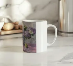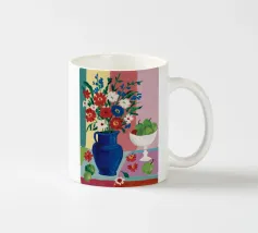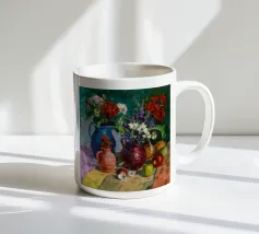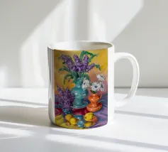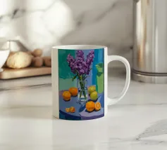 Una vivace composizione di natura morta con profumati lillà viola in un vaso blu intenso, accanto a un vaso blu più piccolo, mele verdi e limoni gialli, il tutto su un allegro sfondo giallo.