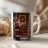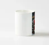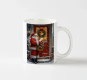 Un tradizionale motivo natalizio: Babbo Natale con cappotto rosso e sacco dei regali si trova davanti a una porta d'ingresso rossa, decorata con una ghirlanda, luci e regali. La delicata nevicata e i colori caldi creano un'atmosfera di festa nostalgica e piena di magia e gioia. Perfetto come immagine natalizia, poster di Babbo Natale, arte natalizia retrò, illustrazione invernale, arte murale festosa, idea regalo di Natale, arte natalizia nostalgica, decorazione natalizia, poster festivo, opera d'arte natalizia e accogliente decorazione domestica.