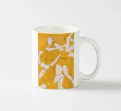 Un'opera d'arte astratta di figure femminili danzanti delineate in nero su uno sfondo giallo vibrante, che esprime ritmo e movimento in uno stile minimalista.