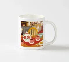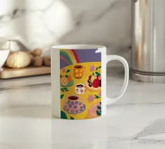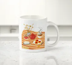Una classica scena di colazione con un croissant su un piatto e una tazza di caffè con cannuccia a righe, su una tovaglia di percalle gialle. La composizione è calda e invitante, con un'atmosfera da caffè accogliente e senza tempo.