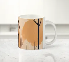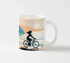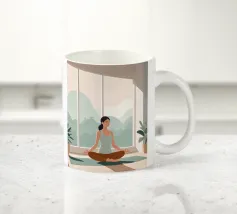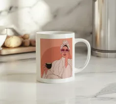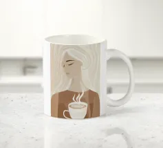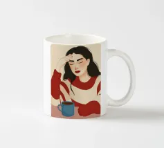 Una donna che tiene in mano una tazza di caffè caldo nella morbida luce del mattino. I toni delicati e le linee semplici ne fanno un'opera perfetta per le mattine lente e le routine tranquille.