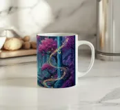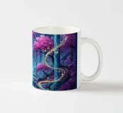 Cascata incantata al chiaro di luna. Un paesaggio surreale caratterizzato da cascate sotto una grande luna luminosa. Alberi di ciliegio in fiore con fogliame rosa vibrante arricchiscono la scena.