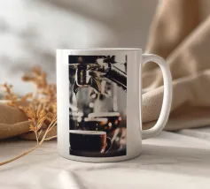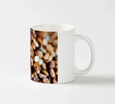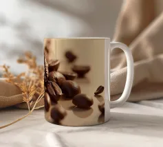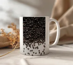I chicchi di caffè marrone sono sospesi in aria sopra una superficie lucida che riflette una pozza scura di caffè preparato, creando un'atmosfera drammatica e accattivante.
