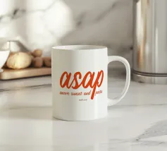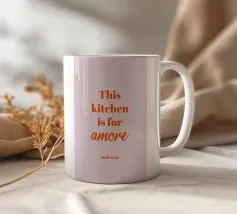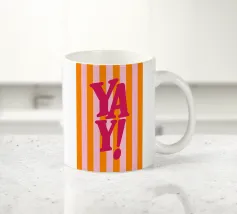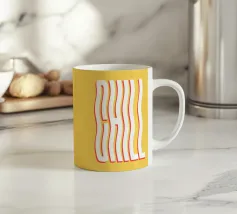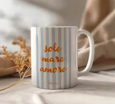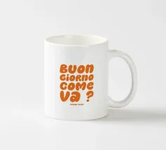 Il design combina la scritta verticale "Ciao" in giallo brillante con uno sfondo vivace di pennellate irregolari in arancione e rosa. Questa scelta cromatica ricorda i bar estivi sulla spiaggia, le tende da sole italiane e la spensieratezza della vita al sud.