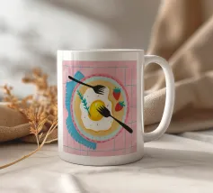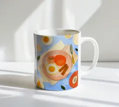 Illustrazione grafica dall'alto verso il basso di una padella per la colazione con un uovo al tegamino, circondata da caffè e foglie tropicali, che creano una vivace composizione flatlay.