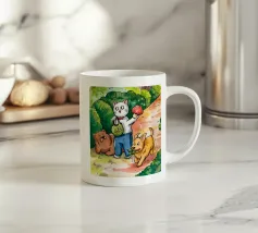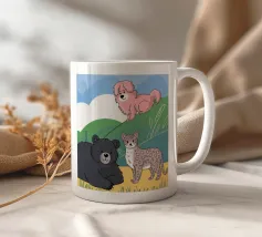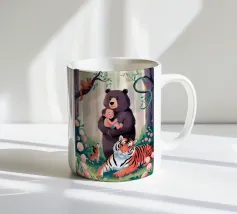 Un'ambientazione serena sulla spiaggia presenta un gatto seduto su cuscini impilati insieme ad altri due gatti, tutti intenti a guardare il tramonto. Le tonalità tenui e l'atmosfera pacifica evocano tranquillità e unione.