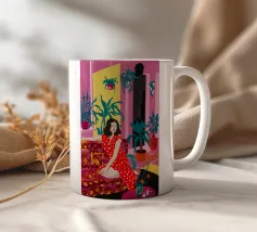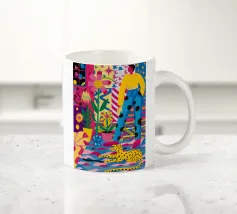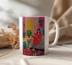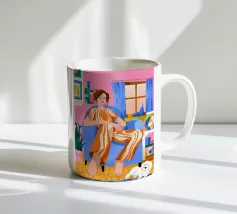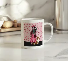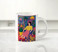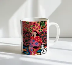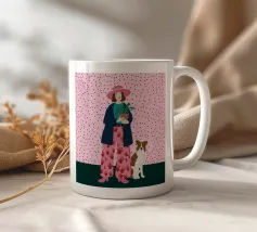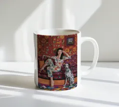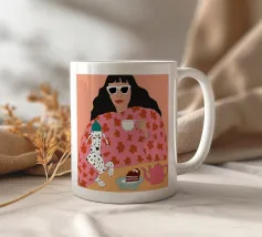 Una donna si trova in una cucina dai colori vivaci con un dalmata al suo fianco, una finestra che mostra una scena all'aperto e vari dettagli della cucina, creando un'illustrazione domestica eccentrica e affascinante.
