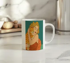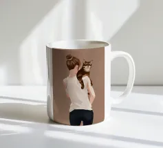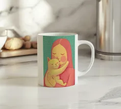 Un'illustrazione semplice e commovente di un piccolo gatto arancione felicemente appollaiato sulla spalla di una persona. La composizione minimalista su uno sfondo blu solido si concentra interamente sul legame affascinante e affettuoso tra una persona e il suo animale domestico.