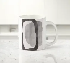 Forme astratte nere e audaci si sovrappongono su uno sfondo chiaro, creando una composizione dinamica e intrigante. Il contrasto tra le forme scure e lo sfondo tenue attira l'attenzione sul gioco delle forme e dello spazio negativo.