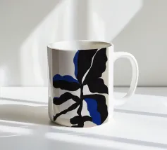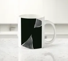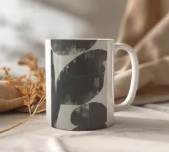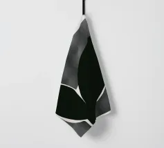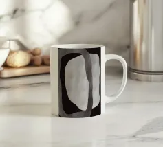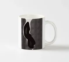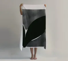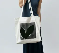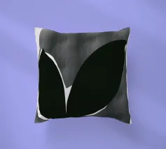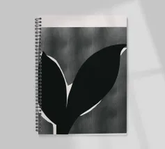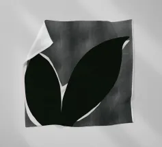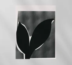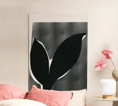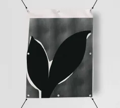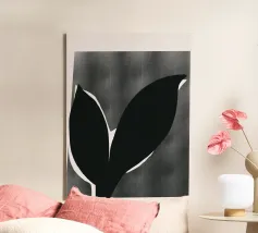 Un'audace silhouette nera di una pianta con due foglie si staglia su uno sfondo grigio strutturato. I colori contrastanti conferiscono un aspetto minimalista e moderno.