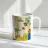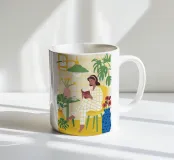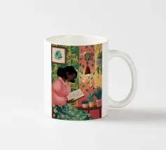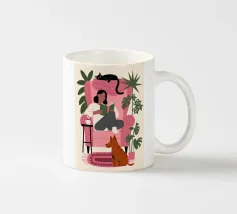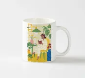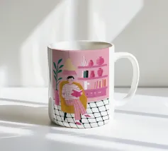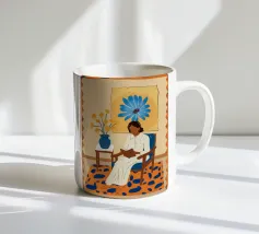 Una donna si gode un momento di tranquilla contemplazione con un drink in un caffè illuminato dal sole. La luce calda, il vestito a scacchi e le piante circostanti creano una scena serena ed elegante di vita quotidiana.