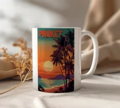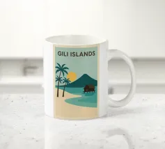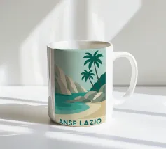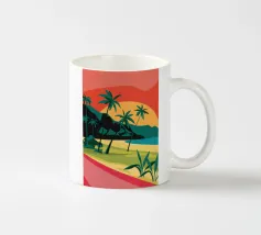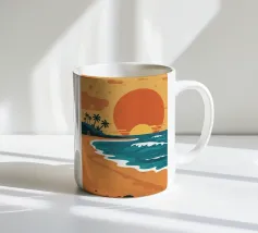 Un poster di viaggio in stile vintage raffigura una serena scena di spiaggia con palme e montagne, con il testo "Picasso", che evoca una fuga nostalgica e artistica verso la costa.