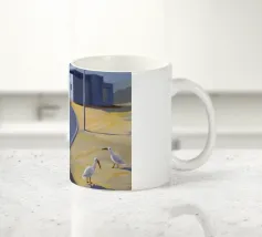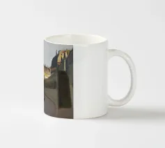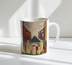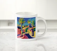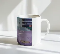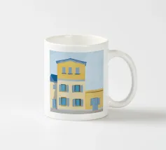 Un sentiero giallo brillante si snoda elegantemente attraverso un paesaggio minimalista di edifici grigi e squadrati. Il dipinto è uno studio sul contrasto dei colori e sulle forme geometriche pulite, che creano una scena urbana serena ma di grande impatto visivo.