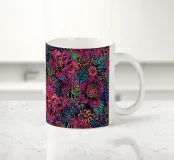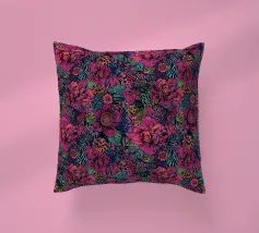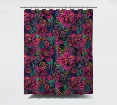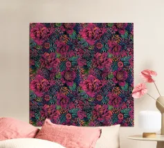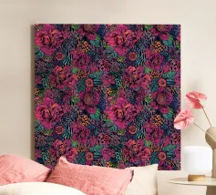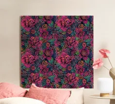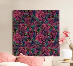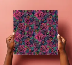 Un motivo floreale ricco e vibrante, caratterizzato da fiori magenta, rosa e corallo con fogliame verde acqua, turchese e verde lime su uno sfondo blu scuro. Questo disegno botanico lunatico combina un'eleganza cupa con fiori luminosi dai toni gioiello per un contrasto sorprendente. Perfetto per gli amanti dei fiori scuri, per i fan dell'estetica dark, per gli appassionati dei toni gioiello e per tutti coloro che apprezzano la bellezza drammatica dei fiori vibranti su sfondi scuri con un tocco moderno e sofisticato.