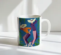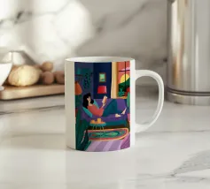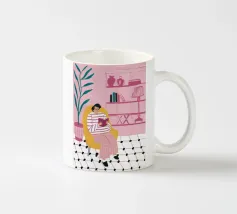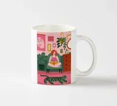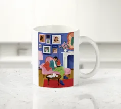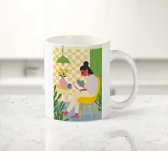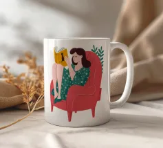 Una donna si accoccola su un divano verde, immersa in un libro e con una tazza di tè vicino. La stanza è decorata con piante e opere d'arte, creando una scena perfetta di confortevole solitudine e fuga intellettuale.