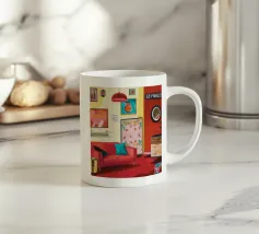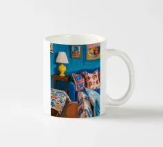 Un lussuoso divano di velluto rosa si trova tra due tavolini con lampade, in una stanza con pareti rosso intenso e tende blu a fantasia. La scena è equilibrata, serena ed emana un'eleganza sofisticata e lunatica.