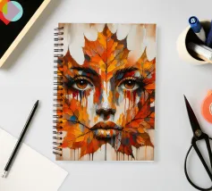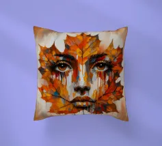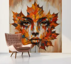 Pittura acrilica di un volto di donna su una foglia. Pittura astratta surreale di occhi, naso e labbra.