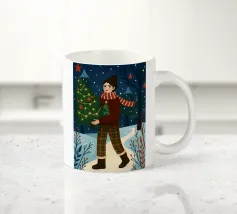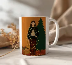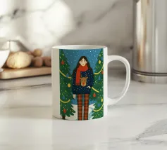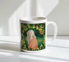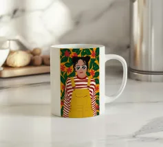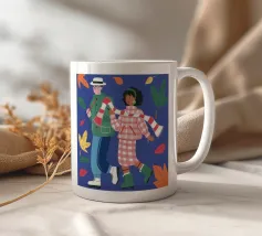 Una scena autunnale con una giovane donna che cammina lungo un sentiero che attraversa una colorata foresta autunnale. Lo sfondo è di un vivace azzurro cielo, che crea un contrasto deciso con le tonalità calde delle foglie e del fogliame autunnale. La donna indossa uno spesso maglione marrone, una sciarpa giallo senape avvolta attorno al collo e pantaloni a righe verticali arancioni, gialle e bianche che riprendono le tonalità autunnali circostanti.