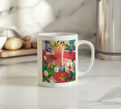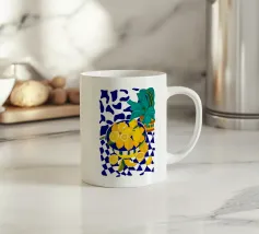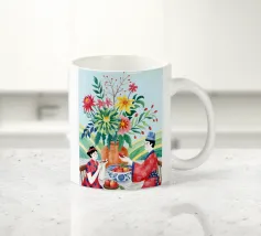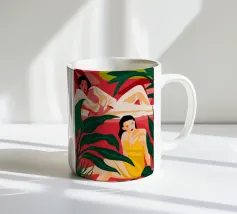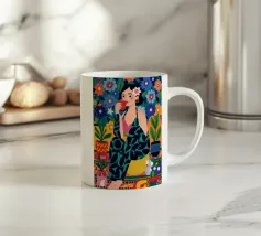 Un ritratto stilizzato di una donna con fluenti capelli scuri circondata da un'abbondanza di fiori e frutti colorati, che celebra la vita, la fertilità e la creatività.