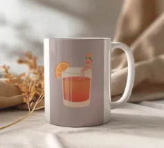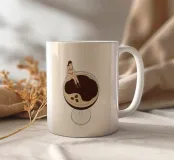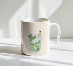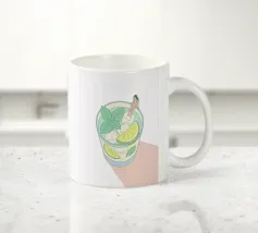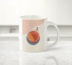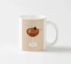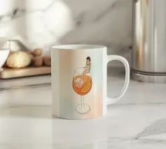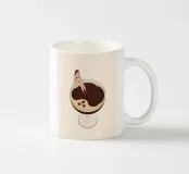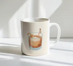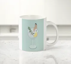 Illustrazione originale di una donna in miniatura in costume da bagno che immerge le gambe in un bicchiere di Espresso Martini. La superficie nera e spumosa del cocktail mette in risalto i chicchi di caffè galleggianti, creando un'atmosfera chic, energica ed estiva. Questa scena poetica fonde il mondo del caffè con quello delle vacanze. Perfetta per un bar, una caffetteria o un'area relax dall'estetica contemporanea.