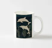 Due delfini che nuotano in acque blu profonde con morbide piante marine intorno a loro. I toni delicati e il movimento calmo creano una scena pacifica.