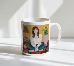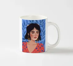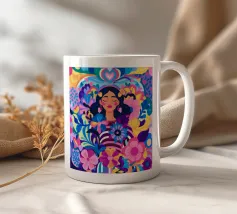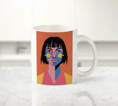 Questo dipinto raffigura una persona con i capelli neri che indossa un abito colorato con forme geometriche. Lo sfondo è rosso e la persona è adornata con grandi orecchini circolari.