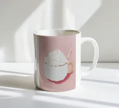 Un'illustrazione spiritosa, deliziosa e golosa di una tazza piena di cioccolata calda e panna montata. Il testo dice: "Non voglio innamorarmi, voglio innamorarmi della cioccolata".