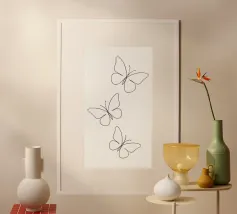 Una farfalla in vista frontale è al centro del motivo. Le ali superiori e inferiori sono disegnate come contorni morbidi e chiusi, il corpo rimane snello, le antenne e i punti di attacco sono solo accennati. La rappresentazione utilizza costantemente una line art minimalista, un contrasto tra bianco e nero e molto spazio libero. Il risultato è simmetria, leggerezza e una chiara attenzione ai contorni e alla forma.