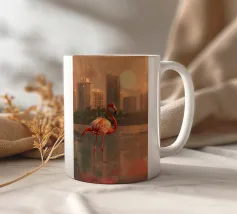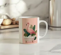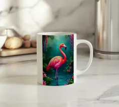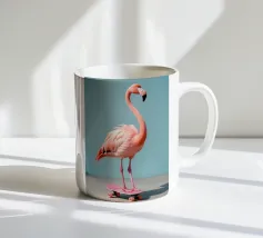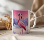 Date alle vostre pareti qualcosa per cui sorridere. Questa opera d'arte audace e stravagante presenta un fenicottero sicuro di sé che si erge fiero in una scena invernale innevata, con tanto di occhiali da sole riflettenti e piume rosa acceso. La vivace palette di colori mescola i caldi toni tropicali con i freddi blu artici, creando un giocoso contrasto visivo che cattura immediatamente l'attenzione.