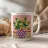 Un'allegra natura morta con fiori gialli e vivaci in un vaso viola ornato da pois bianchi. I motivi giocosi e i colori allegri creano un pezzo che irradia felicità.