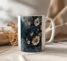 Elegante fotografia di alberi in fiore a cascata su uno sfondo blu scuro.