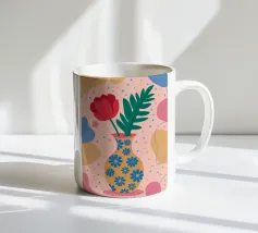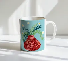 Ravvivate la vostra casa con questo moderno motivo floreale. Il vaso stilizzato in rosso e rosa, circondato da foglie blu e fiori delicati su uno sfondo azzurro, conferisce a questo disegno un aspetto grafico e contemporaneo. Ideale per decorazioni murali, cuscini, tazze, cover per cellulari e molto altro ancora. Questo motivo è perfetto per chi ama i disegni giocosi e colorati con un tocco di arte e modernità. Crea accenti vivaci e si adatta a un'ampia varietà di stili di interni.