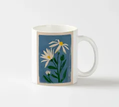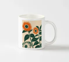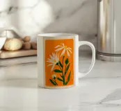 Un dipinto floreale semplificato con fiori bianchi su uno sfondo arancione in uno stile grafico e minimale.