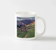 Un dipinto di paesaggio con un grande pagliaio in un campo vicino a un fiume o a uno specchio d'acqua tranquillo. Il cielo è di un grigio tenue e coperto, e la tavolozza generale è sobria con toni terrosi.