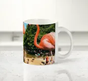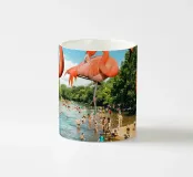 Un gruppo di fenicotteri che se ne sta in riva a un fiume mentre un altro migliaio di persone si diverte a nuotare lì. Vibrazioni surreali e divertenti da spiaggia estiva. Collage originale di MsGonzalez