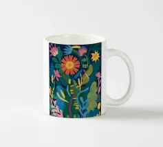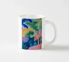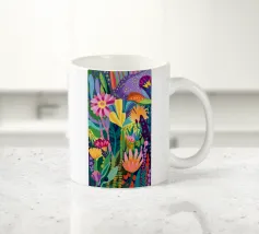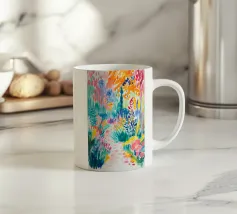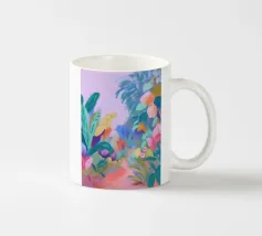 Una scena di foresta vivace e colorata è caratterizzata da un fogliame lussureggiante nei toni del blu, dell'arancio, del rosa e del verde. Varie piante e alberi creano una composizione vivace e dinamica con colori vivaci e contrastanti. L'uso di colori vivaci conferisce alla scena un'atmosfera energica e stravagante.
